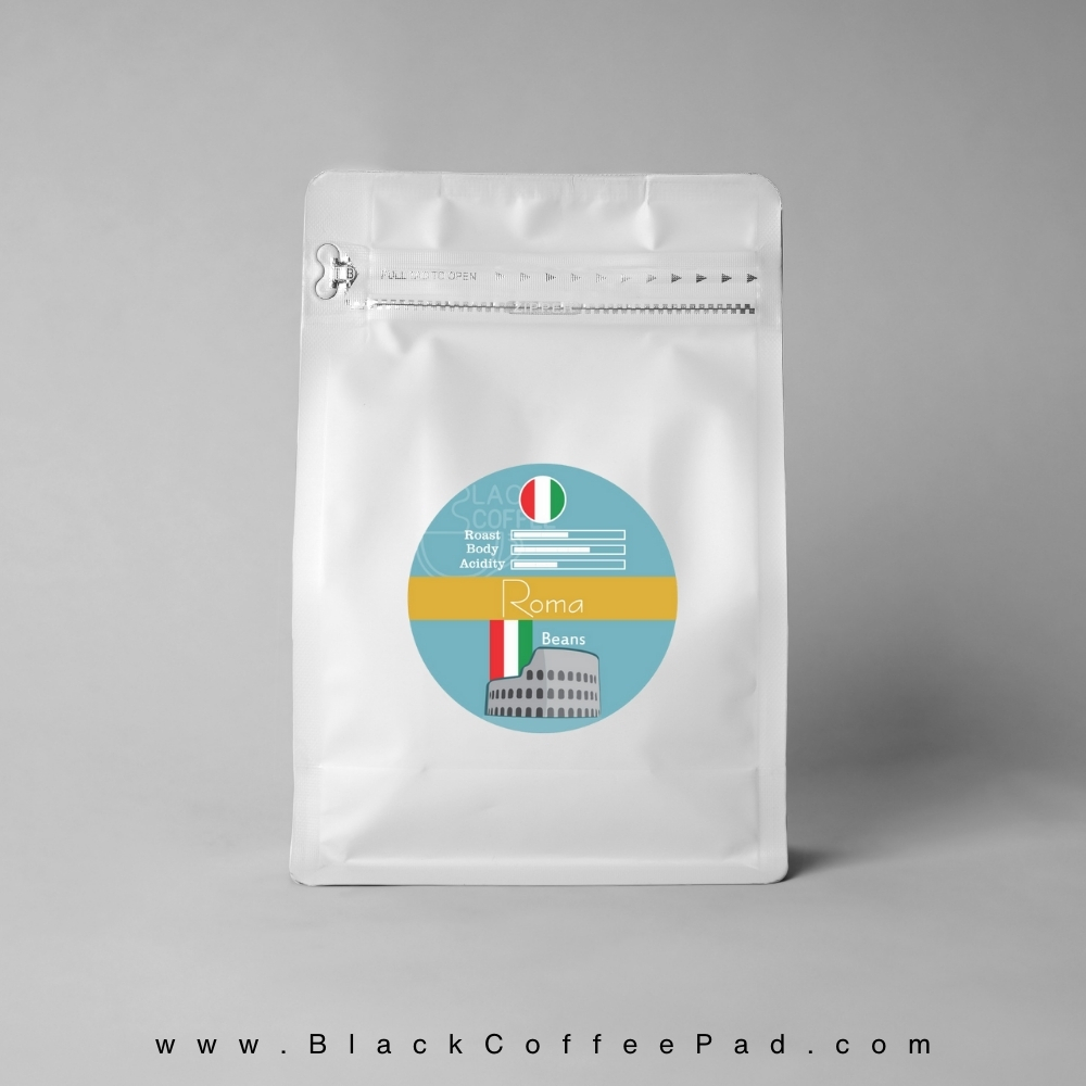 دانه قهوه روما متشکل از دانه های 100 درصد روبوستا با رست مدیوم بوده و کافئین بالایی نیز دارد. از ویژگی های قهوه روما میتوان به بادی بالا اشاره کرد.